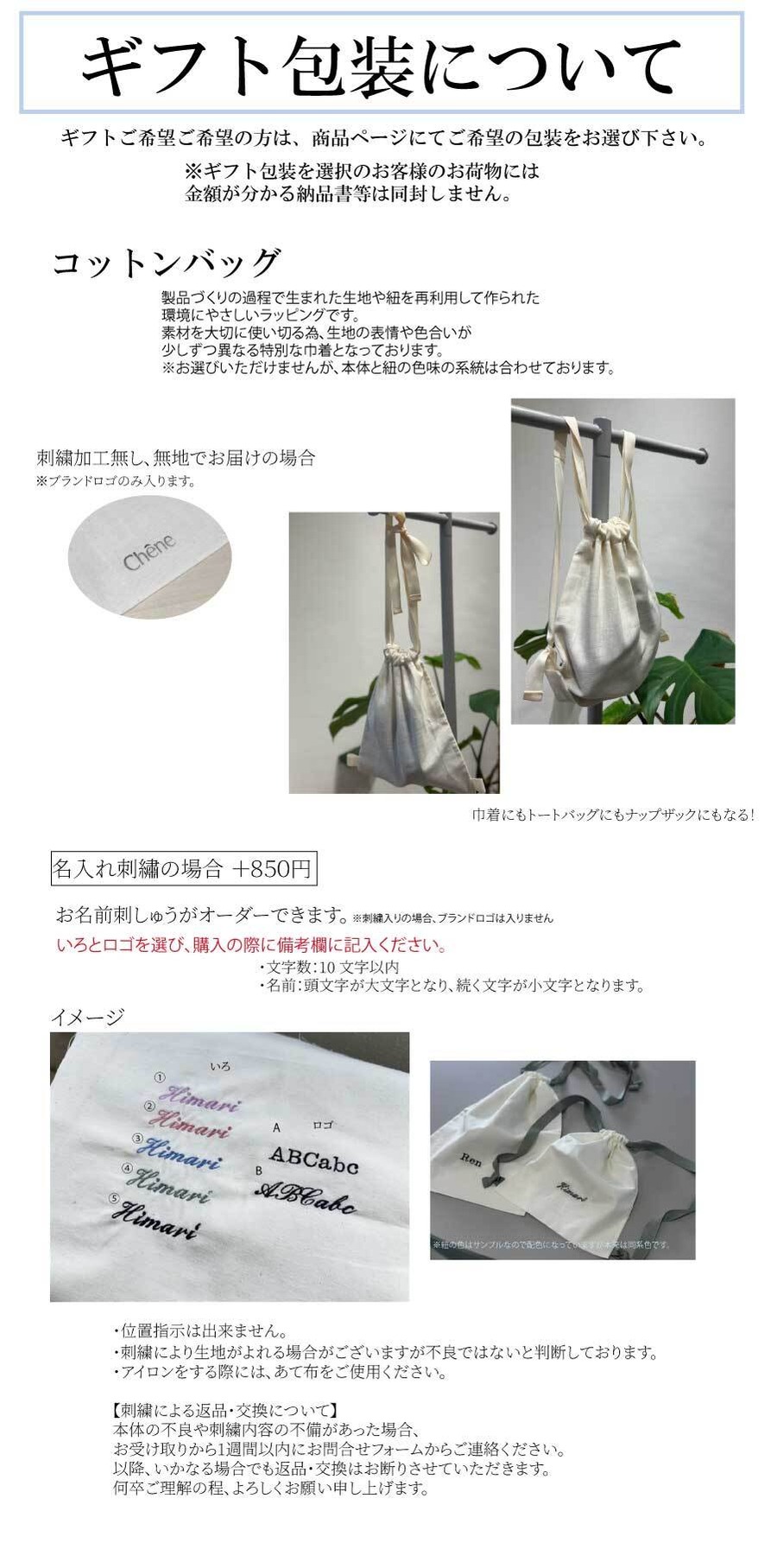 Chêne(シェヌ)は可能な限り環境を壊さず、資源も使いすぎず、未来が美しい世の中であってほしいという願いを込めて、ギフトボックスを廃止し巾着をご準備しました。